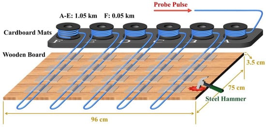 To further investigate the effect of the ultra-low sampling resolution and undersampling techniques on system performance, a multi-point sensing experiment was implemented. The experimental setup was basically the same as that of the previous experiment, except for the deployment of the sensing fiber. The total length of the FUT was set at 5.25 km, and it was composed of five sections, each comprised 1 km of standard single-mode fiber and 0.05 km of fiber patch cords. The connection was completed in the order of a 1 km optical fiber followed by a 0.05 km patch cord, and a segment of these optical fiber patch cords were fixed on a wooden board with tape, as illustrated in Figure 6. The length, width, and thickness of this wooden board were 96 cm, 75 cm, and 3.5 cm, respectively. A steel hammer was used to continuously strike the marked area of the wooden board, and the resultant mechanical vibrations were recorded by the Φ-OTDR system. The file size of each acquisition was 512 MB, corresponding to 1.074 s sensing time. The ultra-low sampling resolution and undersampling techniques were applied to these data, and the results are shown in Figure 7.