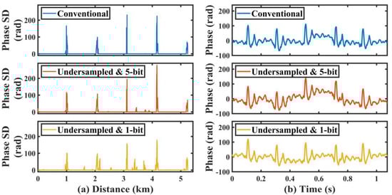 (a) Standard deviation (SD) curve of the phase signal (17,179 traces) demodulated from the conventional data, undersampled 5-bit data, and undersampled 1-bit data; (b) time-domain vibration waveform at 5.2 km.