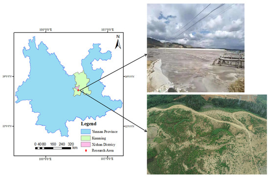The research area referred to the Ma’anshan near the outlet of Dianchi Lake in Yunnan Province, as shown in Figure 1. The whole research area was in the plateau mountain area, with a total area of 0.40 km2. The terrain in the research area is steep and belongs to the typical plateau mountain landform. The tailings pond is made of artificially continuously adding solid tailings slag on the basis of the low dam. If the dam body is sufficiently stable, tailings or other industrial wastes with low phosphorus content obtained after the selection of phosphate rock can be stored in the crest area. The mixed tailings and industrial wastewater are discharged to the tailings flood discharge area in liquid form, and then the water is dried in the sun, and finally accumulated in the tailings sand storage area in solid form [8].