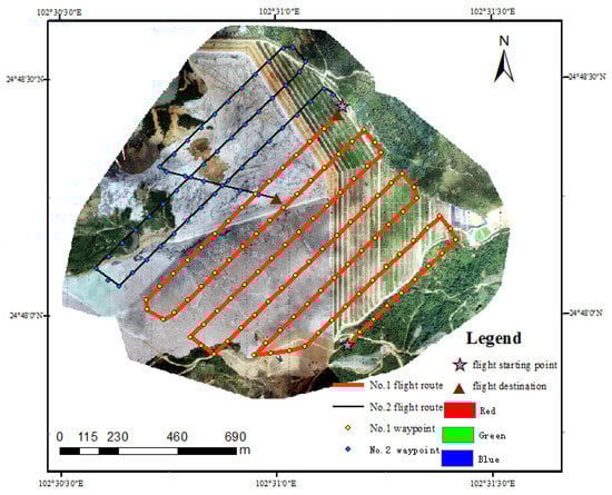 The experimental data were collected on 3 October 2020. Image data in the research area was acquired by DJI Phantom 4 RTK using dynamic post-processing differential technology. During the data acquisition, route planning for the research area was carried out according to the actual geographical environment and traffic conditions by combining with the Google Earth platform. Then, appropriate parameter settings were selected based on the route planning in the early stage and data quality requirements in the later stage. As the data acquisition was mainly oriented to the analysis and application of vegetation information in the open-air phosphate mining area around Dianchi Lake, the flight parameters were set as follows: heading overlap degree was 80%, side overlap degree was 70%, and average flight altitude was 250 m. The weather conditions of this aerial survey were good, and two sorties were flown. In total, 155 images were collected, with an average resolution of 0.07 m. The specific route planning in shown in Figure 2.