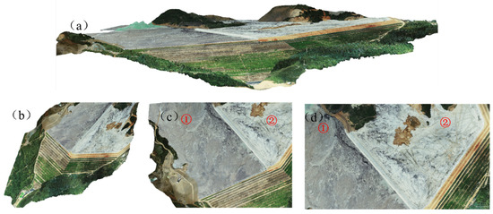 Construction of DIM point cloud. (a,b) the whole research area was completely constructed without point cloud holes. (c,d) disclosed that the tailings areas showed obvious contours. (1, 2 represent tailings areas have different water content).