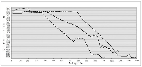 The DIM point cloud was employed to construct a digital surface model, and the section of the research area was drawn from the northwest, west, and southwest directions based on 3D in ArcGIS. As shown in Figure 4, the elevation difference between the tailing sand accumulation area and the bottom of the lawn dam was 140 m, and the lawn dam presented a stepped distribution. The topographic characteristics of the field should be considered in subsequent segmentation tests.