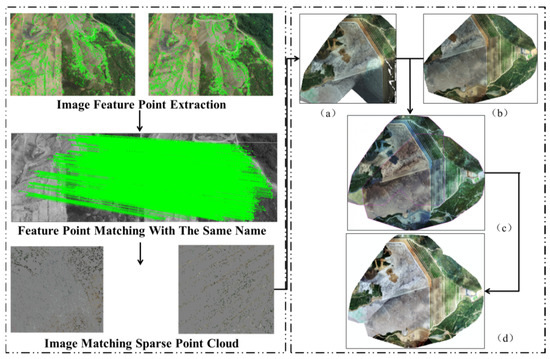 DOM construction process. (a,b) represents the result of the DOM construct. (c) represents the result of matching and fusion (a,b). (d) fusion chromatic difference was eliminated according to color space uniformity, and DOM was completely constructed.
