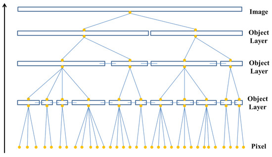 Image segmentation was critical before image analysis, which was widely used in geography, medicine, biology, and many other fields. Image can be segmented by three methods: region-based segmentation method, edge-based segmentation method, and threshold-based segmentation method. There was no general method suitable for image segmentation in the proposed method, so it had to be combined with research experience and actual situation to meet the specific segmentation. The image resolution was gradually improving, and the differences in various ground objects in the image were becoming more and more obvious, so it was difficult to process all ground objects with simple segmentation. Multi-scale segmentation was a bottom-up network structure that calculated the homogeneity value of adjacent pixels based on a single pixel and merged them into larger objects if the homogeneity value was lower than the specified threshold. This cycle was carried out until the pixel-point combination stopped at the specified scale [12], as shown in Figure 6.