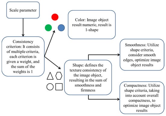 and were set to optimize the results of image objects and make their shape more reasonable. The specific calculation equations are shown as follows.