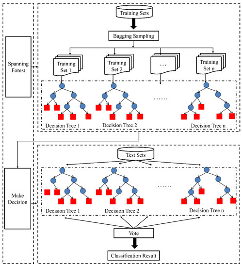 The process of RF algorithm mainly included the generation of training sets, the construction of decision trees, and the execution of the algorithm. As shown in Figure 9, for a forest with a scale of N, N decision trees were required to produce the same number of training sets. In addition, Bagging was incorporated to randomly sample the N training samples, which may lead to duplicate sampling of some samples. CART was undertaken as a classifier in RF, where index of each attribute was calculated in the training of CART [14]. Nodes were classified by selecting the minimum index, and a decision tree was established according to the recursive form. The calculation process of splitting nodes based on the minimum Gini impurity criterion was shown in Equation (8).
