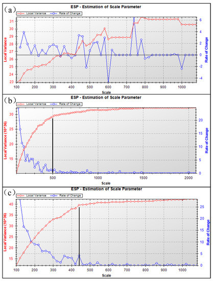 DOM segmentation scale. (a) represents the local variances of the segmentation object were counted to obtain the LV − ROC curve. (b) represents the LV − ROC curve obtained after the elevation was added. (c) represents the LV − ROC curve obtained after the slope was added.