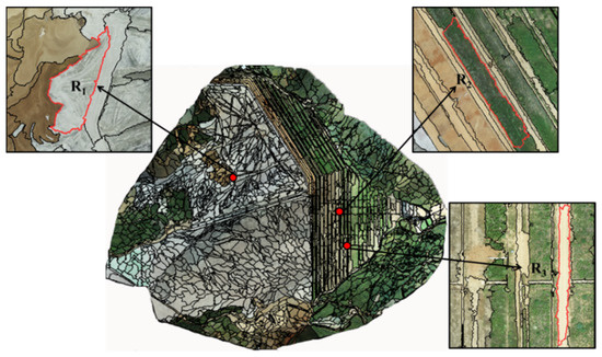 Segmentation results. R1 is the tailing sand and a small part of bare soil mixed area. R2 and R3 were the mixed distribution areas of vegetation and bare soil.