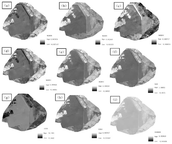 ArcGIS Pro was employed to calculate the 9 visible VIex through visible band according to the equations in Table 2, and the gray histogram of each index was obtained, as shown in Figure 12. In NGRDI, NGBDI, MGRVI, RGBVI, ExG, VDVI, and EGRBDI, the bright color region represented the vegetation information, and the relatively dark color region showed the non-vegetation information such as bare soil and tailing sand. The above VDVI could show the vegetation information well, but the gray value of NGBDI vegetation was close to that of bare soil, so that they were easy to be confused in the subsequent classification. The dark areas in MRBVI and CIVE represented the vegetation information, and light areas represented the non-vegetation information. CIVE was more adequate than MRBVI in identifying the vegetation area in turf dam area. Brightness of vegetation in the left part of tailing sand and that in the lawn dam was different, and it was easy to cause mistakes and omissions in classifying the vegetation information. Therefore, it was necessary to classify them separately and then categorize them as vegetation.