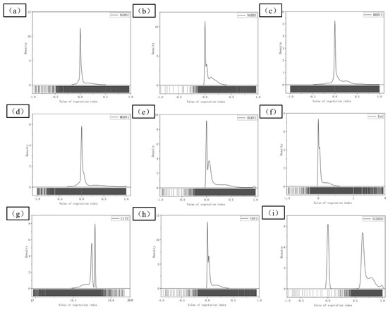 To determine the most suitable visible VI for this test, the number of pixels in the gray histogram was counted. If there was an index with obvious double peaks, the corresponding difference and performance of different ground classes were relatively better, as shown in Figure 13. The abscissa and ordinate represented the value of VI and the number of pixels, respectively. The CIVE, EGRBDI, and VDVI were analyzed based on the statistical analysis of the error of VI. Double peaks were found in Figure 13g–i. Although the distance between double peaks of VDVI was very close to each other, some pixels of CIVE and EGRBDI exceeded the theoretical range, while NGRDI, MRBVI, and MGRVI were excluded because no double peaks were found. Combined with number gray histogram analysis, statistical classification error analysis, and bimodal index, the VDVI which was most suitable for the classification vegetation information of the tailing mining area was selected.