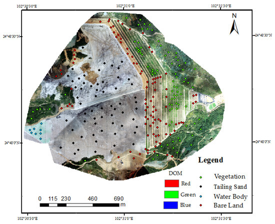 Compared with other methods, unmanned aerial vehicle (UAV) remote sensing shows short period and high resolution, so it can adapt to the rapid acquisition and updating of vegetation coverage in small areas. He Haiqing [3] et al. extracted the soybean coverage by the rest of the features of interference by relying on the two-dimensional (2D) and remote sensing image technologies combined with the three-dimensional (3D) point cloud coverage of the soybean extraction method; the results showed that this method is suitable for the complex background of flower bud differentiation period coverage to extract soybean, gamma enhancing the index of green leaf vegetation extraction accuracy can be improved, and the overall accuracy of coverage extraction combined with 3D point cloud information is more than 98%. Yang Xu [4] et al. comprehensively considered the advantages of 3D image point cloud, Hue, Saturation, Intensity (HIS) and matching point cloud, and applied them to land cover type recognition and extraction. Li Pengfei [5] et al. selected the visible-band difference vegetation index (VDVI) suitable for the extraction of slope vegetation of the dump in the research area through the sample survey method and UAV remote sensing and visible vegetation index (VI) calculation, and estimated its vegetation coverage. In order to study the vegetation coverage on visible images, Xie Bing [6] et al. constructed a Digital Orthophoto Map (DOM) by UAV aerial images, and found that the overall accuracy of vegetation coverage extraction reached 93.5% by adopting the red–green–blue (RGB) ratio VI (RVI). Wang Meiqi et al. [7] took xiyuan No.4 Coal Mine administration area as the research area for the flight experiment, collected image data by UAV, converted RGB color space of image into Hue–Saturation–Value (HSV) color space, and limited the value range of H and S values, aiming to analyze the vegetation coverage of abandoned mines; the results showed that UAV remote sensing technology can quickly extract vegetation and calculate vegetation coverage, with an error of lower than 6.86%.