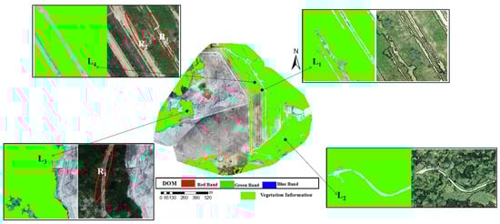 Based on ArcGIS, four types of land information of DOM classification were read and screened according to attributes, and only vegetation information was retained. Then, the vegetation classification information was overlayed by RF algorithm to DOM, as shown in Figure 15. Large areas covered by vegetation in the research area could be identified based on the visual interpretation combined with the field survey. L1 and L2 did not misidentify the bare land embedded in the middle while recognizing vegetation information. However, bare soils of R1 in L3 and R2 and R3 in L4 were wrongly identified as vegetation information. After the DIM point cloud was mapped, bare soil information of wrongly identified vegetation was removed manually.