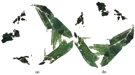 The DOM covered attribute features and geometric features with full content, which can directly express the research area truly. DOM is constructed based on the automatic point conversion of POS data, fine solution of external position elements, and digital differential correction. The specific results are shown in Figure 5a,b. As two sorties were flown, the DOM of sorties 1 and 2 should be constructed for image matching and image fusion, as shown in Figure 5c. Finally, fusion chromatic difference was eliminated according to color space uniformity, and the DOM with 21,715 × 18,108 pixels and resolution 0.08 m was completely constructed, as shown in Figure 5d.