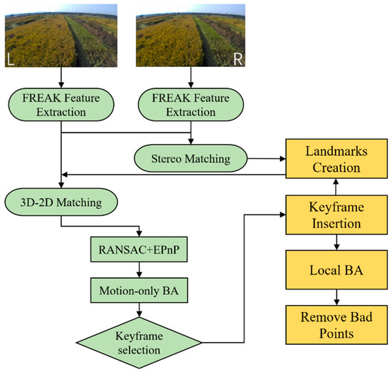 The main focus of our method concerns the way a combine harvester estimates its motion using a stereo camera. Most state-of-the-art visual perception systems make use of a multithread design to run in real time without FPGA or GPU acceleration. We follow this principle by adopting a two-thread architecture. The architecture and components of the proposed method are shown in Figure 1, and consist of a front-end and a back-end. The front-end thread detects features, creates landmarks, and outputs the poses of harvesters at a specific frame rate. The back-end thread is in charge of jointly refining landmark positions and keyframe poses at a lower rate.