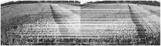 Next, we establish 3D–2D correspondences by means of projecting those 3D landmarks into the current frame and searching for their 2D features. A constant velocity motion model is adopted to expedite matching, under the assumption that large motions between successive frames are prohibited because of the inertia of the harvester. The search range for each landmark is constrained to a circle of radius pixels ( = 8), with the centre of the circle determined by the velocity of the previous frame. The 3D–2D correspondence is established following the same strategy as the stereo matching procedure, as shown in Figure 3.