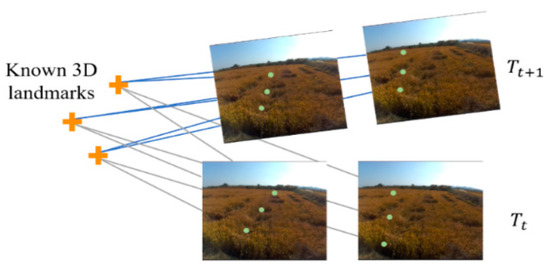 3D–2D correspondence; the crosses denote a sparse set of landmarks, the green dots represent their corresponding 2D projections in the image. and denote the pose at time t and t+1, respectively.