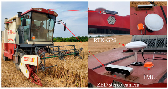 The proposed method was developed for combine harvesters based on a real agricultural scene. A data acquisition platform was developed for our research, as shown in Figure 5. A wheeled combine harvester (Model: HaoLong, World Co., Ltd., Danyang, China) was employed to reproduce the trajectory, and a stereo camera (ZED, Stereolabs Inc, San Francisco, CA, USA) was mounted on top of the cabin, in the middle of the combine harvester, with a forward-looking setup at the height of 3.06 m. The image was acquired at 10 Hz with the resolution of 1280 720 pixels. Table 1 shows the technical specifications of the ZED. A localization unit was equipped on our platform, mounted about 10 cm behind the stereo camera on the top of the harvester, which included an RTK-GPS (Model: UM220- IV NV, PENA ELECTRON, Shenzhen, China) and an IMU (Model: MTi-10, XSENS, Enschede, The Netherlands). The accompanying location and orientation data of the GPS/IMU allowed us to compare the performance of our method. All experimental data collection was carried out by a laptop. Image data and GPS/IMU data were timestamped according to the system clock and synchronized.