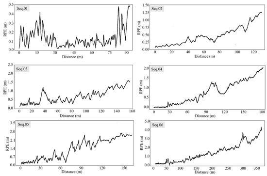 The experimental dataset consisted of six stereo sequences, with a total length of 1093.8 m and a total time of around 1362 s, collected in a rice field in a farm in Danyang during the harvesting season. In order not to damage the crop and to obtain a smoother trajectory, sequences 3 to 6 were collected on stubble fields. The combine harvester was controlled manually, traversing the field in a predetermined path with an average speed of 0.8 m/s. The trajectory was recorded by the RTK-GPS/IMU sensor as the trajectory ground truth, as shown in Figure 9. Table 2 details the particularities and challenges (from easy to difficult) of our dataset.