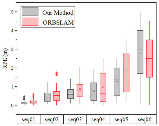 The Absolute Pose Error (APE) and Relative Pose Error (RPE) [34] were used as evaluation metrics to quantify the accuracy of the estimated pose in our proposed method. Each sequence was run 10 times to alleviate the randomness of the multithreading system in the results. We used EVO (GitHub—https://github.com/MichaelGrupp/evo) (accessed on 16 June 2018) for computation and visualization. The Absolute Trajectory Errors are shown in Figure 6, and measure the overall performance of our method by computing the Euclidean distances between the estimated pose and the corresponding ground truth. Figure 7 exhibits the Relative Pose Errors of Seqs. 01 to 06, which calculate the cumulative drift over the fixed travelling distance. Our proposed method achieved favorable results on the regular harvesting paths (Seqs. 01 to 03). However, our method still encountered challenges in long-term and large-scale operations (Seqs. 04 to 06). We also compared the performance of our method with ORB-SLAM2 (GitHub—https://github.com/raulmur/ORB_SLAM2) (accessed on 22 Dec 2016), and plotted the boxplot shown as Figure 8.