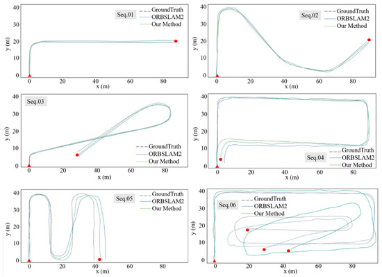 Trajectories were aligned and depicted by EVO tools for both methods along with GPS ground truth, as shown in Figure 8. Our proposed method outperforms the ORB-SLAM2 on most sequences, except Seq. 06 (Figure 9). The results also show that loop closure has little effect on reducing drift, which is explained in Section 5.