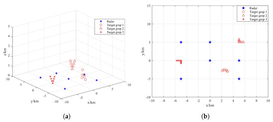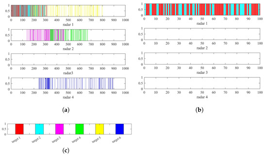 It is assumed that the radars in the distributed netted radar system are synchronized in time and that all transmit chirp signals. In addition to the different positions of the targets in the target group, other characteristic parameters are the same, such as speed, size, etc. The transmission signal carrier frequency is = 10 GHz, pulse width = 1 us, bandwidth B = 300 MHz, pulse repetition frequency PRF = 1000 Hz and scheduling interval T = 1 s. There are 4 radars and 6 targets in scenario 1 and 6 radars and 20 targets in scenario 2, as shown in Figure 4 and Figure 5, respectively.
