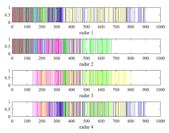 Figure 7 is the result of the resource scheduling receiving timing diagram of all radars in a scheduling interval. The diagram shows that Radar 1 completes the scheduling of Target 1, Target 2, Target 5 and Target 6. The number of pulses received by Radar 1 to Target 1–6 is 132, 130, 0, 0, 129 and 130. Radar 2 completes the scheduling of Target 1, Target 2, Target 3 and Target 4. The number of pulses received by Radar 2 to Target 1–6 is 132, 130, 117, 118, 0 and 0. However, Radar 3 only completes the scheduling of Target 3, Target 4 and Target 5 and does not schedule Target 6. The number of pulses received by Radar 3 to Target 1–6 is 0, 0, 117, 118, 129 and 0. Radar 4 completes the scheduling of Target 3, Target 4, Target 5 and Target 6 but does not schedule Target 1 and Target 2. The number of pulses received by Radar 4 to target 1–6 is 0, 0, 117, 118, 129 and 130. Radar 3 does not schedule Target 6 because after Radar 3 completes the scheduling of Target 5, Target 4 and Target 3 with high threats. The remaining observation time cannot meet the azimuth coherent integration time of Target 6. Therefore, Target 6 with a low threat of Radar 3 will be abandoned; that is, it will not be imaged. In the same way, Radar 4 also abandons Target 1 and Target 2 with low threats. Additionally, Figure 7 shows that the scheduling of each target for each radar is sparsely distributed. Therefore, each radar in the distributed netted radar system can perform sparse imaging of the targets through the compressed sensing method to save pulse resources.