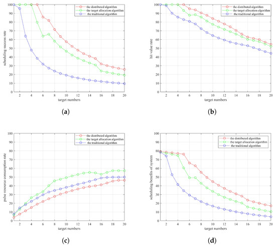 In order to verify the effectiveness of the algorithm, we will compare the three performance indexes proposed in Section 4. This paper analyzes the conventional netted radar scheduling algorithm (referred to as the traditional algorithm) in [11]. The conventional netted radar scheduling algorithm uses a pairing function (referred to as the target allocation algorithm) and the distributed netted radar scheduling algorithm (referred to as the distributed algorithm) proposed in this paper. The traditional algorithm uses the projection size to complete radar and target pairing. The target allocation algorithm uses a pairing function to complete radar and target pairing. The distributed algorithm uses a pairing function to complete radar and target pairing. The system scheduling benefits of the three algorithms are calculated using Equation (13). The following is a simulation for Scenario 2. Figure 8 shows the comparison results of the performance indexes of the three algorithms under different numbers of target after 1000 Monte Carlo experiments are averaged.