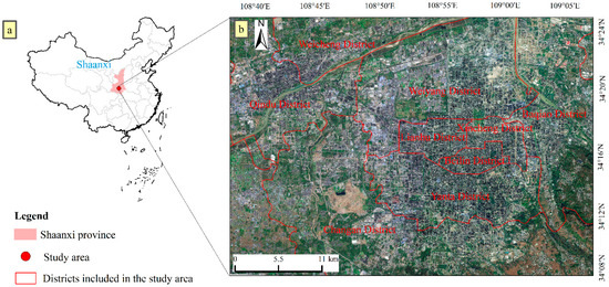 Location of Shaanxi Province and the study area in China (a); schematic view of the main city of Xi’an from a GF-6 image (b).