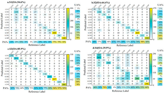 Figure 6 shows LCZ maps of the four schemes. Among the four classification schemes, S3 is the most representative scheme reflecting the actual features, followed by the S2 scheme, the S1 scheme, and the S4 scheme. The urban building classes in the S3 scheme can be well distinguished, and the land cover classes, such as roads, water bodies, vegetation, and bare land, can be accurately identified. It is noteworthy that the LCZ map of the S3 scheme depicts the primary direction of the road network, and S3 is the only scheme capable of identifying LCZE (bare rock or hardened pavement) (Figure 6c). Although the classification effect of the S2 scheme is not as good as that of the S1 scheme, S2 can also effectively distinguish urban building and land cover classes. Additionally, a small amount of LCZE can be identified, with a good recognition effect for water bodies (Figure 6b).