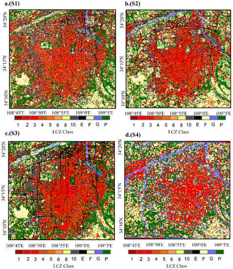 LCZ map of scheme S1 (a); LCZ map of scheme S2 (b); LCZ map of scheme S3 (c); LCZ map of scheme S4 (d).