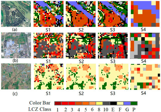 Figure 7 shows the LCZ classification results for three localized parts of study areas a, b, and c. Figure 7a shows a typical local area where high-rise buildings surround mid-rise buildings with nearby water bodies. Based on the LCZ classification results, the S1 and S3 schemes using high-resolution images can distinguish high-rise and mid-rise buildings well. Figure 7b shows the heavy industrial agglomeration area, and the S2 and S3 schemes are better at identifying the heavy industrial agglomeration area than the other schemes and can distinguish the mid- and low-rise residential buildings from the heavy industrial agglomeration area. However, the S2 scheme is not as effective as the S3 scheme in identifying road networks. The S3 scheme can distinguish multiple LCZ types, such as bare land, vegetation, heavy industry, and road networks. Figure 7c shows the mixed area of bare land and low-rise residential buildings. The S2 and S3 classification results are concentrated and contiguous, and they are similar to the real land structure. The S1 classification results have more misclassifications, and the S4 scheme can only identify the concentrated and contiguous areas.