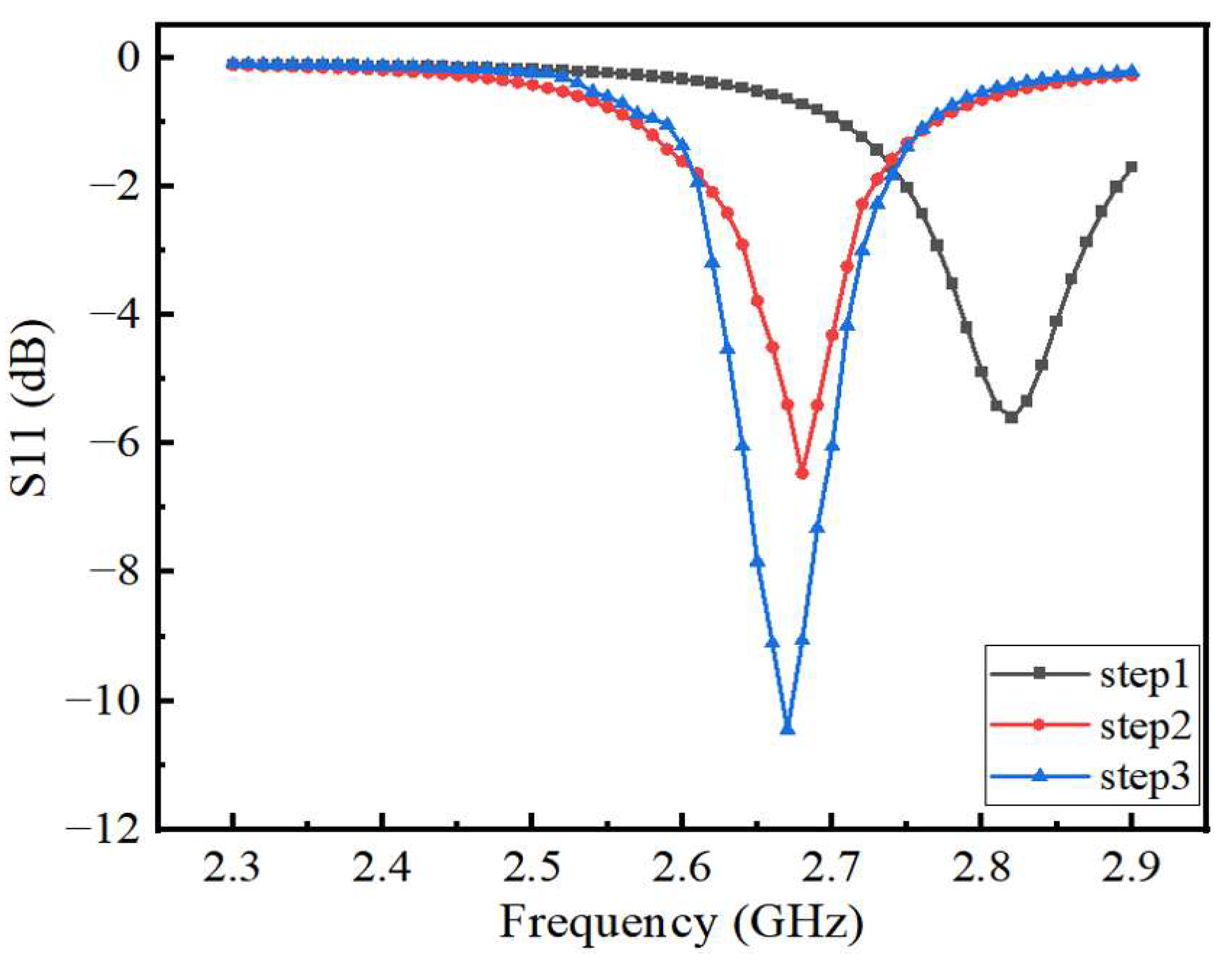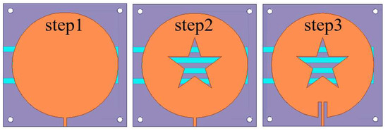 The optimization steps of the shape of the sensor patch are shown in Figure 2. Starting from the conventional circular patch antenna designed for the center frequency, the optimization of the slot of the patch and the optimization of the slot of the microstrip line are carried out successively. The circular patch was chosen because it has a single parameter for generating frequency, the radius of the patch. The effective radius of the circular antenna is calculated by Equation (2) [21].