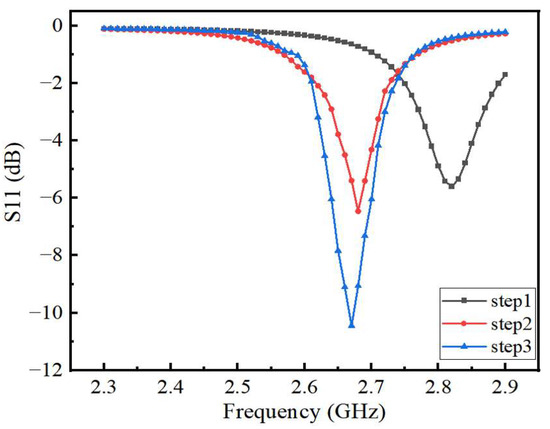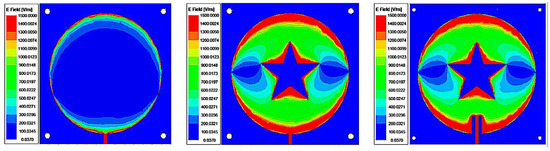 In order to improve the sensitivity of the sensor, the liquid to be measured needs to be placed under a strong electric field. Slotting the sensor can increase the electric field strength at the slotted area. In this paper, we choose to slot a pentagram because the slotted area is irregular, which can make the sensor obtain a strong electric field. The slotting can also reduce the return loss to improve the sensor’s information transmission performance. The S11 parameters corresponding to each optimization step are shown in Figure 3. After slotting, the center frequency of the sensor shifts to the lower frequencies, and the amplitude of the corresponding return loss decreases for each step. The smaller the return loss, the better the measurement performance of the sensor becomes. Figure 4 shows the electric field distribution corresponding to each step of the designed sensor. It can be seen that the electric field of the slotted sensor is stronger compared to the circular sensor, and the strong electric field is mainly concentrated at the microstrip line, the slotted edge and the edge of the circular patch. These concentrated electric field distribution places can maximize the electric field disturbance, and the microstrip channel position of this design is below the maximum electric field (confirmed from the color code). The slotting on both sides of the microstrip line is to obtain a better return loss for the sensor and improve its measurement performance.