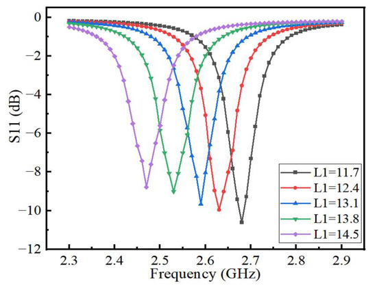 Compared with the traditional patch antenna, this sensor has a pentagram-shaped slot in the middle of the radiating patch and another slot next to the feed line, so that the antenna has a good electric field strength and a narrow bandwidth. The size of the slotting has a large impact on the performance of the sensor. In this paper, the side length of the pentagram L1 and the side slot length of the feeder L2 are optimized, and the best size is finally selected. As shown in Figure 5, the resonant frequency of the sensor gradually decreases with the gradual increase in the pentagram side length L1, but the effect on the reflection coefficient amplitude is small. Figure 6 shows the variation of the return loss with the length of L2 at the center frequency point of the sensor. For the antenna, the sensor has a good reflected signal when its return loss is less than −10 dB, so the optimal length of L1 is 11.7 mm and the optimal length of L2 is 9 mm as can be seen from Figure 5 and Figure 6. After the optimization of the above steps, the structural parameters of the sensor are shown in Table 1.