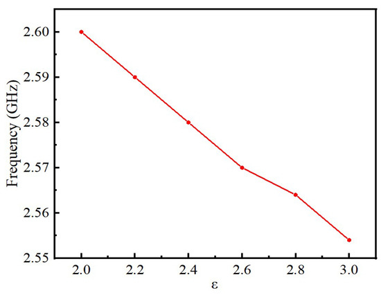 The shape and size of the radiation patch and the material of the dielectric substrate directly affect the performance of the sensor. This is mainly because the edge field from the radiation patch to the dielectric substrate will cause electromagnetic radiation from the patch to the substrate. In this design, the feed mode of the microstrip line is used to provide a signal source for the patch [18,19,20]. This feeding mode is used because the feeder is coplanar with the microstrip antenna patch, which is easy to produce. The feeder also has radiation, which can reduce the gain of the antenna. The shape and size of the microstrip patch, the width, length, and position of the slot can affect the antenna input impedance, change the resonant frequency of the sensor, and thus affect the performance of the sensor. The position of the slot affects the electric field distribution of the sensor, which makes the sensor more sensitive to the change of dielectric permittivity, thus improving the sensitivity of the sensor.