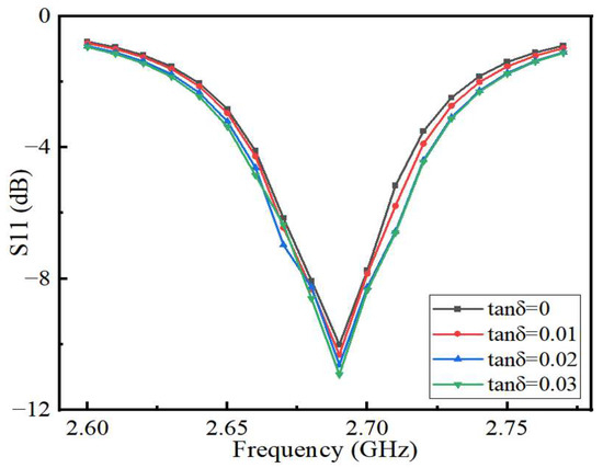 To investigate whether the sensor is feasible for detecting the quality of edible oil, we change the permittivity of microchannels and use HFSS to simulate microchannels with different permittivity to test the sensitivity of the sensor. The permittivity of the microfluidic channel was increased from two to three and by 0.2 units each time. The simulation results are shown in Figure 7. From Figure 7, the operating frequency of the sensor decreases gradually with the increase in the dielectric constant, in a linear relationship. As the dielectric constant of the microfluidic channel gradually increases, the charge polarization within the dielectric medium causes an increase in the capacitance of the sensor, which can lead to a shift in the operating frequency of the sensor toward lower frequencies. However, when the permittivity of the microfluidic channel is 2.8, the shift of resonant frequency decreases because the permittivity of the microfluidic channel is equal to the permittivity of the PDMS, therefore affecting the offset of the operating frequency of the sensor. In general, the permittivity of most edible oils changes between 2.4 and 3 before and after heating [24,25]. Therefore, only the dielectric constants of two to three were simulated in this paper. To investigate the effect of the change of dielectric loss factor of oil on the reflection coefficient of the sensor, the dielectric constant of the microfluidic channel is kept constant in the simulation, and the size of the dielectric loss tangent angle of the microfluidic channel is gradually increased from 0 to 0.03, and the dielectric constant is increased by 0.01 each time. The relationship between the S11 parameters of the sensor and the variation of dielectric loss tangent angle of the microchannel is shown in Figure 8. The results show that the dielectric loss has no effect on the resonant frequency of the sensor but has a certain effect on the amplitude of the reflection coefficient, and the amplitude of the reflection coefficient increases with the increase in the loss factor, but the change is not very obvious. The edible oils chosen as examples in this paper are rapeseed oil and soybean oil which are most commonly used. When rapeseed oil and soybean oil are not heated, the dielectric permittivities are 2.41 and 2.64, respectively. However, their dielectric permittivities rise to 2.61 and 2.83, respectively, after being heated at 170 °C for 12 h. The heating of edible oil not only changes its dielectric constant but also has a greater impact on its loss factor. As the heating temperature increases, the dielectric constant of the oil increases faster, indicating that the chemical reactions of the edible oil molecules are more intense and generate more polarized substances under high-temperature conditions. At the same time, under the same heating conditions, different types of edible oil have different increments in dielectric constant, which is due to the different compositions of fatty acids in each oil. However, the change trends of the dielectric constant are the same. Since the change of the loss factor has no effect on the operating frequency of the sensor and the influence on the return loss can be neglected, the dielectric loss of edible oil is not measured in this study. The sensor has good sensitivity in the quality detection of edible oil.