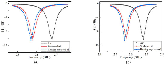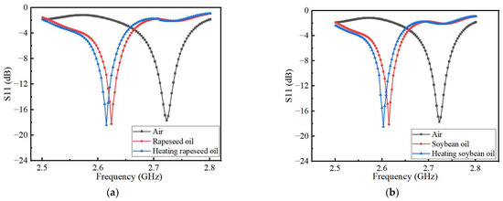 The dielectric permittivity of edible oil is affected by a variety of factors, among which the high temperature has a significant influence on it. When the edible oil is heated at high temperatures, its dielectric permittivity will increase while its quality will deteriorate. Figure 9a,b show the simulation results of S11 parameters of canola oil and soybean oil before and after heating, respectively. The operating frequency of the heated edible oil shifted about 10 MHz to the low-frequency direction than before heating.