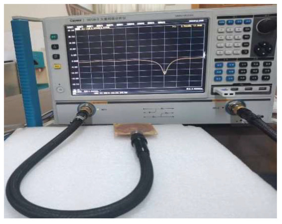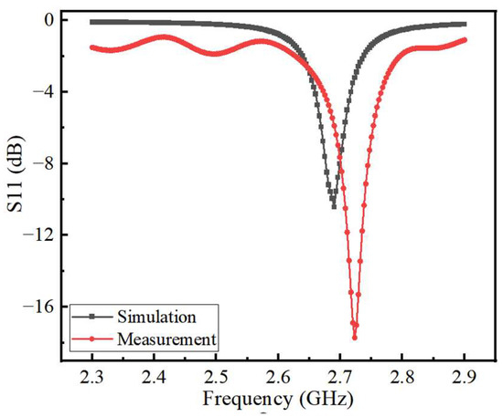 The sensor designed in this paper is shown in Figure 10, and its size is 70 mm × 70 mm × 1.4 mm. The holes located at the four top corners of the sensor are used to connect and secure the antenna patch at the top, the microchannel in the middle, and the substrate at the bottom. The reflection coefficient (S11) of the sensor measured by the vector network analyzer is shown in Figure 11. The comparison of the measured and simulated results of the S11 parameters is shown in Figure 12. While the measured resonance frequency of the sensor is 2.72 GHz and the return loss is −17.7 dB, the simulated resonant frequency is 2.68 GHz and the return loss is −10.4 dB. Compared to the simulated results, the measured resonant frequency shifts about 40 MHz to the low-frequency direction. These variations are due to errors introduced during the production of the sensor and parasitic capacitance added by the SMA connector. The measured return loss is 7.3 dB which is smaller than the simulated one. The amplitude of the measured return loss is greater than that of the simulated result because the model uses coarse frequency resolution to shorten the calculation time during the simulation. The performance of the sensor is unaffected by deviations from the intended frequencies and return loss since the change in the dielectric constant that the sensor measures is dependent on the shift of the resonant frequency. The voltage standing wave ratio (VSWR) of the sensor at the center frequency point is 1.1369. When VSWR < 2, the bandwidth of the resonant frequency is 2.6775 to 2.6813 GHz with a fractional bandwidth of 0.63%. Here, the no-load Q-factor of the proposed sensor is calculated by the following equation [25]