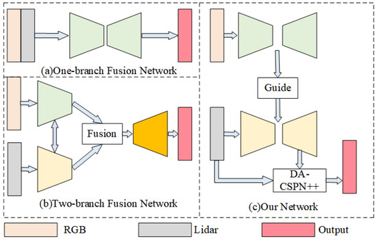 Researchers have developed a variety of solutions, the most recent of which rely on Convolutional Neural Networks. The original and most commonly used depth completion network is the one-branch fusion network [5,7,8] shown in Figure 1a, by feeding features obtained by concatenating features from two different modalities at the channel end into the depth learning network. This learning method is less effective in learning but runs fast.
