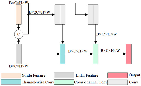 Structural diagram of the lightweight guidance module. It guides features to LiDAR features faster and more efficiently by sharing filtering kernels.