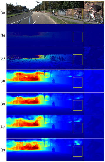 Figure 6 shows the effect of the depth information completion module. Figure 6d,e are the dense depth map without the depth information completion module, and the rates are 2 and 4. Figure 6f,g are the dense depth map when the depth information complement module is added, and the rates are 2 and 4. By comparing the details of the figure edges in the yellow box horizontally and vertically, such as the small protrusion at the backpack and the gap between the human leg and the front wheel of the bicycle, we can see that our depth information completion module had better performance in edge blurring improvement. The dense depth map of human body edges obtained by SGSNet was clearer and more accurate.