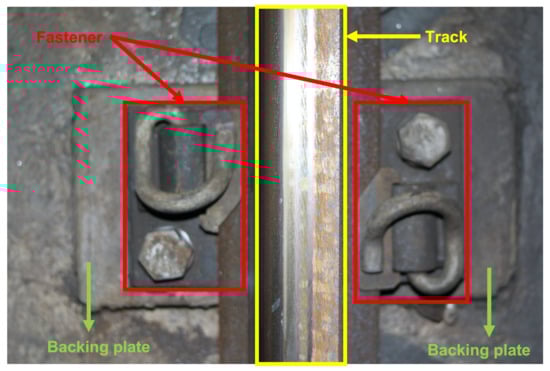 As the lifeline of the whole rail transit system, the safety status of the railway track line directly affects the stability and safety of the operating vehicles during normal driving, as well as the comfort of passengers. Specifically, as shown in Figure 1, the railway track line is mainly composed of key components such as tracks, fasteners, and backing plates. When these key components of the railway track line appear defects and continue to develop and deteriorate, the cost of line maintenance and the difficulty of maintenance decision-making will also increase. To ensure the operational safety and efficiency of rail transit, it is necessary to detect the safety status of key components of railway track lines and generate inspection reports.