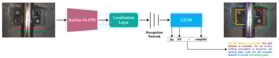 Over recent decades, researchers in this field have mainly made significant progress in the detection technology of rail surface and fastener defects, but there is no further investigation on the issue of the automatic generation of inspection reports. In the entire condition monitoring system of the railway track line, the inspection report is the main basis for maintenance decision-making. For practical applications, it is necessary to investigate the automatic generation of railway track line inspection reports in text format. At present, with the development of computer vision and natural language processing technology, as well as the continually improving computer technology, it is possible to obtain useful information about multiple objects from images automatically. In particular, dense captioning, a technology based on computer vision, is gaining traction in this field [3,4,5,6,7,8]. Dense captioning is a subset of image captioning technology [9] that understands the characteristics of objects, their activities, and relationships and expresses them in natural language. In comparison with other types of image captioning methods [10], this technology focuses attention on image regions containing objects and generates more objective and detailed region-wise captions. Therefore, it is suitable for analyzing railway track line images with multiple key components and clear positional relationships and generating text information about the type, position, status, and mutual relationship of the key components. Whereas, there are still some problems that need to be solved when developing an automatic defect description method of railway track line image based on dense captioning. First of all, it is difficult to use expressions generated by existing methods (e.g., “black office telephone and pen” or “yellow fire hydrant”) to describe the safety status information of the key components from the field images, which requires constructing its own dataset. Secondly, improved regional feature extraction needs to be developed to achieve more accurate regional localization and better defect description performance. Finally, the processing time of each image should be shortened, and the complexity of the processing progress should be reduced so that the improved method can be applied to practical applications.
