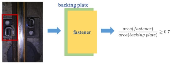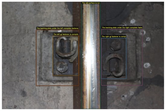 Non-maximum suppression (NMS) algorithm is an important part of the object detection pipeline. In short, the detection boxes are sorted from high to low according to their scores firstly. Then, the detection box M with the maximum score is selected, and all other detection boxes that significantly overlap with M are suppressed. At last, this process is applied to the remaining boxes recursively. According to the design of the algorithm, when two target boxes overlap greatly, the box with a lower score is discarded due to the large overlap area with the higher one, resulting in missed detection. In practice, the railway track line images collected from the field face such a problem during the detection process. As shown in Figure 5, in some images, the overlap between the fastener area and the backing plate area is greater than 0.7, which causes the final description result to be incomplete. To solve this problem, the Soft-NMS [13] method is adopted to replace the NMS algorithm used in the original model.