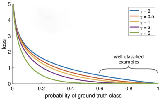 where represents the predicted probability of ground truth class. is a tunable focusing parameter. As shown in Figure 6, when setting , FL reduces the loss of well-classified samples greatly, and pays more attention to misclassified samples.
