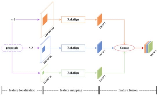 The reverse is also true; when the coordinates of the predicted proposals are obtained, the regional position coordinates corresponding to the proposals in the feature maps of a certain level in the network can be derived from bottom to top. Therefore, in the light of this inference, after attaining the proposals generated by the bounding box and class prediction stage, localize the feature regions corresponding to the proposals in the feature maps of level3, level4, and level5 as the basis for further constructing regional features (as shown in Figure 13). In this way, the finally obtained regional features can be enhanced by fusing the features with multi-level receptive fields.