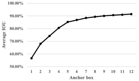 The relationship between the average IOU and the number of anchor boxes is shown in Figure 14. Considering the performance and efficiency of network training, and allowing the prior anchor boxes to better fit the actual size of the target region in the dataset, 9 clusters are chosen as the bounding box priors, which are , , , , , , , , and .
