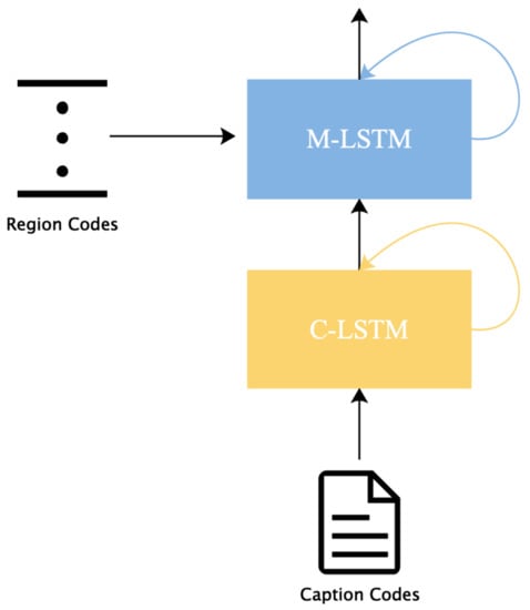Drawing on the work in [60], a stacked LSTM named CM-LSTM is adopted as the language model in the Faster RTLCap model, as deep architectures have powerful capabilities in feature self-learning [61]. Precisely, as shown in Figure 16, CM-LSTM is comprised of two modules: a Caption-LSTM (C-LSTM) for encoding caption inputs and a Multimodal LSTM (M-LSTM) for embedding visual and textual vectors to a common semantic space and decoding to sentence.