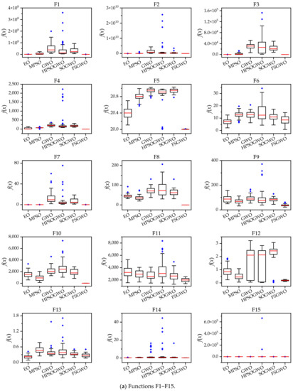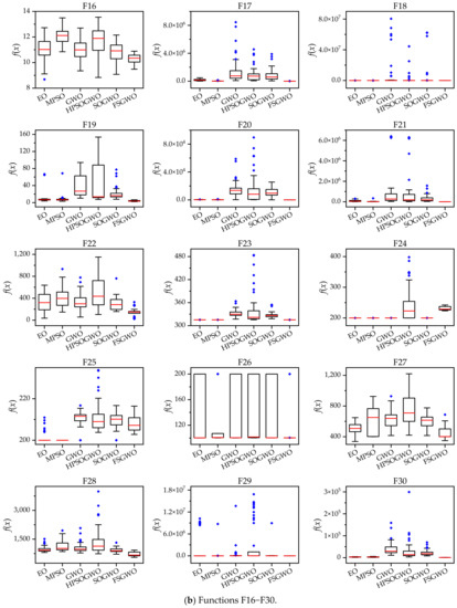 Figure 2 shows box plots of the related algorithms for the 30 test functions which were drawn with 51 calculation results of related algorithms. In Figure 2, the short red line represents the median; the black box represents the upper quartile (Q3) and the lower quartile (Q1); and the blue solid prism represents an outlier.