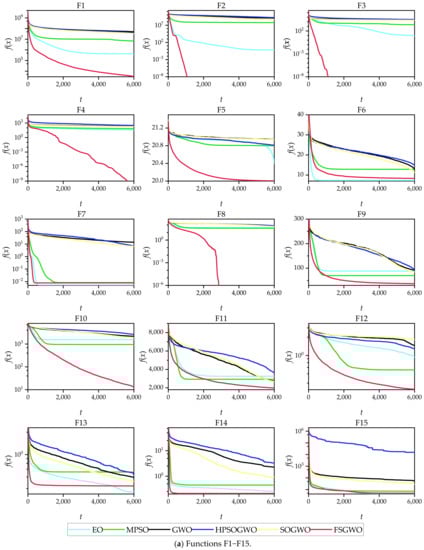 From the mean results in Table 2, the calculated results of FSGWO on unimodal functions F1–F3 were at least four orders of magnitude better than those of GWO, HPSOGWO, and SOGWO. For the F1 function, the exponent of the result of FSGWO was e + 03, while the exponents of the results of GWO, HPSOGWO, and SOGWO were all e + 07. For the F2 function, the exponent of the result of FSGWO was e + 00, while the exponents of the results of GWO, HPSOGWO, and SOGWO were e + 09, e + 09, and e + 08. For the F3 function, the exponent of the result of FSGWO was e + 00, while the exponents of the results of GWO, HPSOGWO, and SOGWO were all e + 04. The results of the unimodal function show that FSGWO had excellent local optimization ability.
